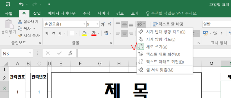 엑셀 상단 홈메뉴에 보시면 세로 쓰기 해제가 있으니 참고해주세요.
