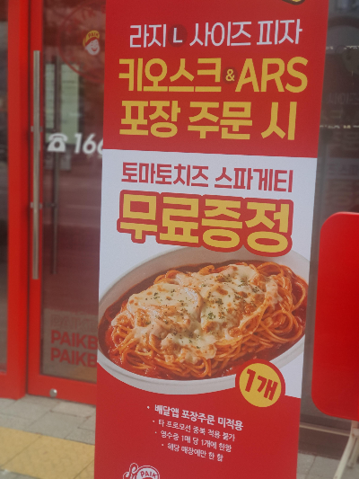 키오스크 포장 라지사이즈 피자 주문시 토마토치즈 스파게티가 무료 증정이라고하니 다들 달려가세요!!